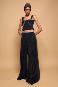 Featuring a sculpted cropped top with structured bust panels, shoulder straps, and Monet green hand embroidery for a contoured effect. Paired with wide-leg trousers with asymmetrical dual-leg design, one in solid navy and the other in Monet green pinstripes, for a bold, modern look.