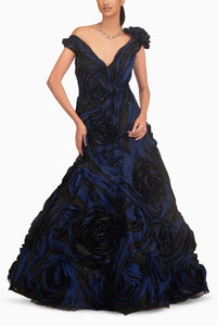 This elaborate gown is adorned with textured organza ribbons and intricate beaded hand embroidery, creating a luxurious design. The exquisite draped taffeta flowers at the bottom flare add a dramatic and elegant touch, making it a truly captivating piece.