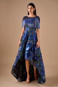 Dramatic yet refined, this high-low gown captivates with its voluminous silhouette and intricate 3D floral embroidery. The ombre blue tones flow seamlessly into sculpted blooms, creating depth and artistry. Finished with a graceful fringed neckline, this piece blends texture, movement, and couture craftsmanship — perfect for evening galas or statement occasions.