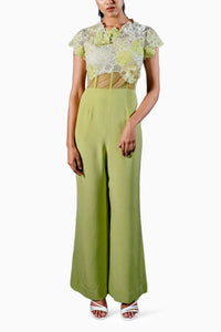 Featuring a 3D floral jumpsuit crafted from delicate tulle, this piece is a blend of whimsical and structured elegance. The jumpsuit is intricately embroidered with three-dimensional florals, adding a rich texture and vibrant visual appeal. An exposed corset detail enhances the figure, providing both support and a touch of allure. Completing the look is a coordinating belt, which cinches the waist and accentuates the silhouette. This jumpsuit seamlessly combines intricate embellishments with bold design elements, making it a standout choice for any fashion-forward occasion.