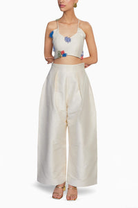Cream track set featuring a top and pants. adorned with multi-coloured 3D flowers.