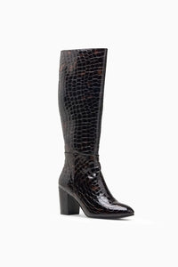 The 4221 Long Boot in black features luxurious crocodile-plated leather with striking cherry brown accents. Designed for comfort, it includes two elastic cuts for a perfect fit and all-day ease.