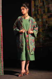 Step into elegance with this ensemble crafted for sophistication and style. The linen coat, adorned with intricate embroidery, exudes timeless charm, complemented by its striking tie-dye silk lining that adds a contemporary twist. Paired with the sleeveless A-line dress, which features matching embroidery, this outfit epitomizes grace and refinement. Perfect for both formal occasions and casual gatherings, this ensemble promises to make a lasting impression with its blend of luxurious textures and exquisite detailing.