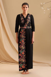 The Black Aarani Applique Jumpsuit with an overlapped front yoke is a sleek and contemporary statement piece, featuring intricate applique detailing that adds texture and depth to the rich black fabric. The overlapped yoke design enhances the structured silhouette, while the embellishments on the belt in Chanderi elevate the look with a touch of glamour and sophistication.