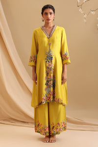 The Yellow Aarani Embellished Flared Kurta is a radiant and elegant piece, featuring intricate embellishments that add a touch of glamour to its flared design. The soft yellow hue and flowy silhouette exude grace, making it perfect for festive or semi-formal occasions. Paired with Dhoti Pants in luxurious chanderi fabric, this ensemble combines traditional charm with contemporary style.