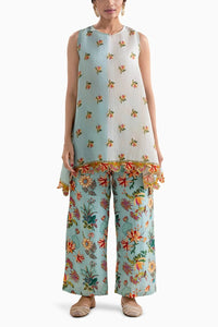 The Blue Arani embellished round-neck kurta features delicate embellishments and a stylish cutworked hem, adding a touch of elegance to its contemporary design. It is paired with printed pants in linen slub, offering a comfortable yet sophisticated look. This outfit effortlessly combines tradition with modern flair, making it ideal for casual or semi-formal occasions.