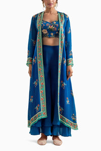 The Blue Aarani printed bustier and crepe palazzo pants create a sleek and stylish silhouette, while the embroidered organza jacket adds an elegant, intricate touch. This ensemble effortlessly blends contemporary flair with traditional craftsmanship, making it ideal for semi-formal or festive occasions.