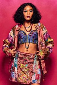 A front-zip silk jacket that features eye-catching patchwork and intricate embroidery, blending modern design with artisanal craftsmanship. This stylish piece adds texture and a splash of color to any outfit, making it an ideal choice for a refined, statement look.
