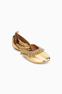 This shiny golden pair of heels is complete with a sleek cut and decoration of intricately crafted steip of golden ghungroos, to give it a playful vide. it is perfectly cut for the romance of casule bruch as well as the decorated elegance of weddings.