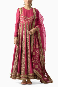 The Aarohi Gulabi Lampi Anarkali Dupatta Set features a floor-length underbust yoke anarkali with alternate lampi kalis, intricate gota patti, and hand-done zari work. Paired with a fuschia silk organza dupatta adorned with gota patti barfi work, this ensemble exudes elegant tradition and vibrant charm.