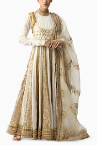 The Aarohi Safed Lampi Anarkali Dupatta Set features a floor-length underbust yoke anarkali with alternate lampi kalis, intricate gota patti, and fine hand-done zari work. Paired with a white silk organza dupatta showcasing gota patti leheriya design, this elegant set blends tradition with timeless grace.