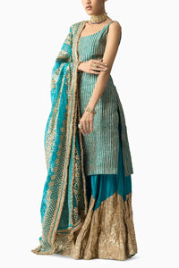 The Aarushi Sharara Set features a turquoise lampi striped kurti paired with a half-lampi flared sharara. Completed with a fine gota patti work dupatta, this elegant ensemble combines silk chanderi, and silk organza for a perfect blend of tradition and style.
