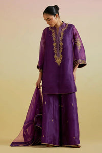 Our Aashra Kurta Set features a long, intricately designed neckline and sleeves accentuated with delicate embroidery, complemented by finely detailed fabric lining and facing that add a touch of opulence.