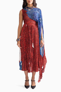 Featuring Abigail Red Dress by Saaksha & Kinni from Botanica Collection. This wave print dress showcases hand micro pleats and a dramatic hanging shoulder trail, blending intricate texture with a striking, flowing silhouette for a standout, elegant look.