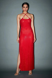 Featuring the Abigail Red Gown by ITRH's Diwali Jaaneman Collection, this stunning red gown is crystal-embellished with a criss-cross design and a side slit, offering a captivating mix of elegance and allure for a show-stopping festive look.