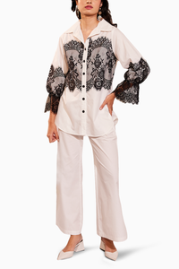 Featuring the Acacia White Co-ord Set from Sttavoss's Everbloom Collection. This white co-ord set is elevated by intricate black lacework, offering a stunning twist on a classic style. Crafted from poplin for comfort, it's a gorgeous choice for any occasion.
