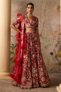 This ensemble features a heavy embroidered chintz print lehenga and blouse adorned with intricate mirror embellishments, creating a mesmerizing blend of tradition and contemporary style. The raw silk fabric lends a luxurious texture, while the net applique embroidered dupatta adds an ethereal touch to the overall look. Perfect for special occasions and festivities, this lehenga set effortlessly combines elegance and sophistication, making you the center of attention at any event. Redefine your ethnic charm with this timeless and beautifully crafted ensemble.