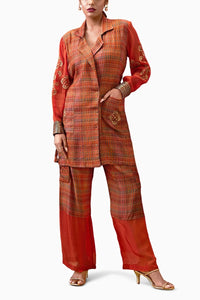 The Orange Adah Embellished Blazer Top with a back waist tie-up exudes modern sophistication, featuring intricate embellishments that add a touch of glamour. Paired with matching pants in luxurious Malaysian Silk, this ensemble offers a sleek and polished silhouette. Perfect for formal or semi-formal events, it blends bold color with elegant detailing for a standout look.