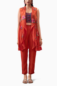 The Orange Qala Printed Crop Top and Pants offer a bold, vibrant look with a modern print, perfect for a chic and stylish ensemble. Paired with an Embroidered Organza High-Low Jacket, the outfit gains an elegant and dramatic flair, with intricate embroidery adding texture and sophistication. This combination is ideal for making a statement at festive or formal occasions.