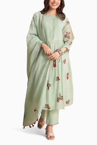 This mint green three-piece set is a delicate and refreshing ensemble. The kurta features soft pleats on the bodice, embellished with charming floral embroidery in rich rust tones, adding a vibrant contrast. Paired with straight pants finished with scalloped edges, the outfit is completed by a matching dupatta with scalloped borders, and playful tassels. This outfit is a perfect blend of subtle elegance and intricate detailing, ideal for any occasion.