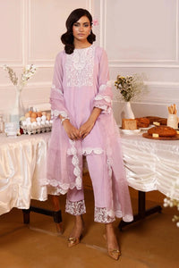 Featuring premium Cotton Chanderi for a soft, graceful drape, this refined ensemble is accented with intricate dori work for an elegant finish. The high round neckline offers a classic, sophisticated touch, while 3/4th sleeves with embroidered cuffs add subtle detailing. The short kurta is beautifully finished with scalloped edges and delicate embroidery, paired with straight pants highlighted by embroidered hems. A matching dupatta with scalloped embroidered borders completes this timeless blend of elegance and contemporary style.