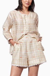 Unveiling the After Glow Rosette Shirt Top, a captivating masterpiece in Chanderi fabric. Its asymmetrical gathering and loop button embellishments redefine elegance with a hint of avant-garde flair. With a relaxed silhouette, it offers comfort without compromising on style. Adorned in a mesmerizing landscape gingham print, it's a bold statement of individuality.