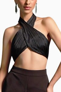 Elevate your look with this stylish black halter neck Afterglow top, featuring a chic tie at the back and elegant pleating on the bust. Perfectly paired with the black Lucia pants, this ensemble is ideal for both day and night outings. Dress it up or down for effortless sophistication!