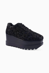 Our Afterglow wedge sneakers are crafted from luxurious black satin and adorned with intricate khicha, zardozi, and cutdana work. Lattice and floral motifs in black and bronze threads intertwine across the pair, each stitch adding depth, texture, and a glow that feels eternal.