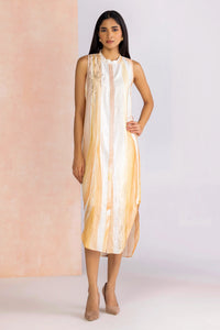 Agate Roots Dress is crafted in a breathable linen blend, designed in a sleeveless silhouette with a neat round neckline, curved hemline, and side slits for effortless movement. Accented with subtle gold stud work, it offers a comfort fit with understated elegance for daytime, casual, and evening occasions.