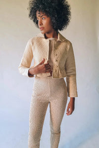 The Aged Ivory Hexagon Jacket Set features a stylish, contemporary design in 100% cotton cambric. The jackets geometric hexagon detailing pairs flawlessly with the matching ruched pants, creating a chic, modern look in a timeless aged ivory hue.