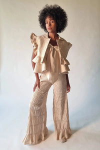 The Aged Ivory Jacket Quilted Set blends classic sophistication with modern flair. Featuring a 100% cotton cambric top, a tailored cotton jacket, and metallic illusion cotton blend pants, this three-piece ensemble offers a striking, elegant look in timeless aged ivory.