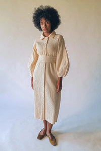 This aged ivory ripple lycra cotton dress features lantern sleeves, fabric buttons, and a removable, adjustable ruched elastic belt for a customizable fit. Made from breathable 100% cotton poplin, it combines comfort and style in a contemporary, elegant design.