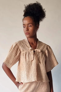 The fabric was smocked but did not stick to her, rather it stood up on its own. The resulting loose, boxy fit was a dream to wear. Once she tied the drawstring around her chest into a bow, she barely felt the fabric of the top touch her; and when it did, it felt like being soothed by a burst of flower petals. She'd found the quintessential summer top.