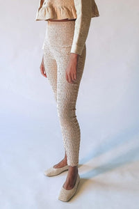 She sauntered ahead with ease and grace. The ruched elastic tape pants fit as if they had been stitched and molded, only for her. The waist stretched and hugged, remodeling itself as she moved.