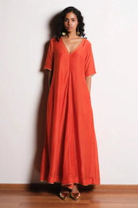 Featuring the Agni Tara Jumpsuit in rich orange Chanderi silk. It showcases bijiya gota detailing on the neckline, hemline, and sleeves. Fully lined and handcrafted in India, this jumpsuit includes side seam pockets and a front zipper for easy wear and comfort.