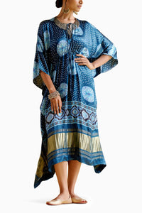 Blue Color Kaftan in digital printed Kalamkari deisgn with cut Dana tasseling embellishment on the neck with Center string