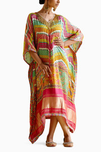 Multi Color Kaftan in didgital printed Kalamkari deisgn with cut Dana tasseling embellishment on the neck with Center string