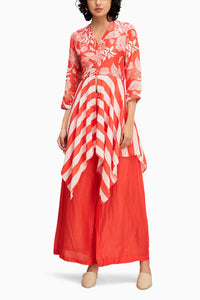 The Red Ahyana Printed Handkerchief Hem Top is adorned with intricate embroidery, featuring a stylish asymmetrical cut for a modern touch. It is paired with flared pants in linen slub, creating a perfect blend of comfort, sophistication, and contemporary flair for a chic, statement-making look.