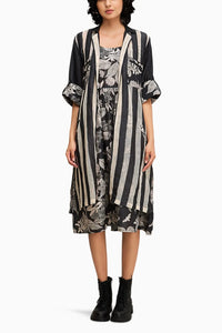 The Black Ahyana Printed Dress with waist gathers in linen slub offers a stylish and flattering silhouette. It is paired with a patchwork jacket featuring front pockets in handloom net, adding texture and elegance to the ensemble. This combination of prints and intricate craftsmanship creates a chic, contemporary look perfect for both casual and semi-formal occasions.