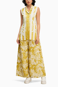 The Yellow Ahyana Printed Cuban Collar Top features vibrant prints and delicate embroidery, offering a stylish and contemporary look. It is paired with flared pants in linen slub, creating a chic and comfortable ensemble perfect for a casual day out or a relaxed evening event.