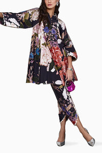 Unleash your inner fashionista with Aimberi Black Multicolored Print Flared Short Kurta and Tulip Pants set. Made from luxurious Chanderi fabric, this 2-piece ensemble showcases a flared kurta and matching tulip pants, adorned with a captivating black multicolored print. Embrace style and elegance with a touch of boldness.
