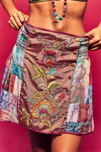 A unique silk tie-dye mini skirt with intricate patchwork detailing and a front-open design, enhanced by delicate embroidery for added texture. This statement piece combines playful colors and a boho-chic vibe, perfect for a bold yet elegant look.