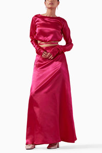 The Aires set consists of a long sleeve top with the detail of fitted "churidar sleeves" (gathers at the wrist) and a wrap detailing going around the waistline area two times, to then be tied at the back. The skirt is an A-line flowy full length silhouette.