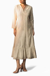 Featuring the Aisha dress, a masterpiece of sophistication and charm. Adorned with intricate all-over embroidery and delicate frills, this dress is crafted from luxurious cotton silk with a cotton lining. Ideal for those seeking timeless elegance with a modern twist.
