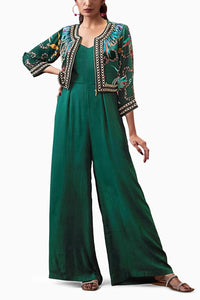 The Bottle Green Aisha Jumpsuit, crafted in crepe, offers a sleek and contemporary silhouette. It is beautifully paired with an embroidered jacket, adding a touch of intricate detailing and sophistication to the look. This ensemble strikes the perfect balance between modern chic and traditional embellishments, making it a standout choice for any special occasion.