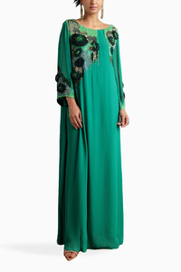 Elevate your style with the Aitana Dress from NSS's The Bloom Collection. Crafted from Georgette & Crepe in a lush Green shade. This single-piece ensemble boasts intricate hand embroidery and delicate beadwork for a uniquely captivating look.