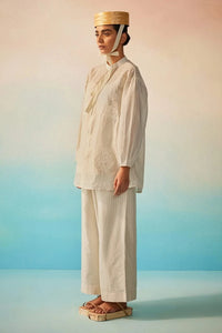 The Akai Ito Mandarin Shirt, with its minimal mandarin collar, appliqudetails, and soft gathered sleeves, pairs effortlessly with the Hama Akari Stripe Pants. Together, they offer a balance of structure and fluidity ideal for days that call for understated polish and comfort.
