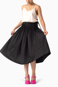 This dramatic cotton satin skirt features an intricate horizon texture that creates a voluminous silhouette. A side button closure and tie-up detail add a sophisticated touch