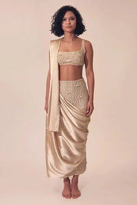 Featuring the Alabaster Satin Pearl Bralette & Skirt Set from ACQUIRE's Lot-5 Collection, this elegant ensemble combines refined luxury and impeccable craftsmanship. The square-neck bralette offers a flattering fit, stretching up to 3 cup sizes, with a seamless finish and intricate hand-smocking, accented with tonal pearl embroidery. Paired with the hand-smocked satin sari pencil skirt, adorned with tonal pearls and featuring an attached 5-meter half-drape pallu, it is designed for easy slip-on and draping. Perfect for any special occasion, this set exudes sophistication and timeless beauty.