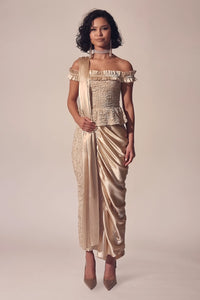 Featuring the Alabaster Satin Pearl Peplum Top from ACQUIRE's Lot-5 Collection, this off-shoulder design exudes elegance with its flattering peplum silhouette and ruffled details. Crafted with intricate hand-smocking and hand-embroidered tonal pearls, this top offers a luxurious and sophisticated look. Perfect for adding a refined touch to any occasion, the Alabaster Satin Pearl Peplum Top blends timeless craftsmanship with modern femininity.